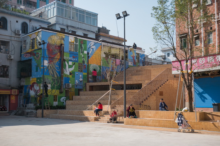 Located on both sides of the squareweretwo metal sheds. Erected on the site of buildings demolished several years earlier, they had served as temporary markets to sell clothing, fruits, and other groceries. The two sheds have been removed and two new temporary structures are built on the site after coordination with local residents. In addition to compensating the same floor area for the village, the new structures have roofs with slanting steps toward the square, forming a continuous interface which allows people to walk all the way from the square onto the roof.Theroof serves as audience seating for basketball games or performances in the square. We also add trees around the square so that even in the summer, the outdoor space is partially shaded. The roof facing South ZhongshanStreet isalso made of slanting steps, forming a roof-top theater; a nice place to enjoy the view of the street and the park.The form of these buildings responds to the small scale and rich roof profileof the adjacent historic buildingsmaking up the Dongguan Guild Hall to the west. Buildings in urban villages are usually finished with a great variety of colors and patterned tiles, and nearby Foshan in Guangdong is the origin of these pottery tiles.We chose a custom-made potterytile as the finish to cover all of the buildings and the square itself, while the terrazzo basketball court is left completelypreserved in the middle. The two new buildings definethe boundary of the square, and abulletin board along the street is redesigned and integrated into the plaza.These efforts help enlarge and extend three-dimensionally the originally limitedpublic space into a hubfor gatherings and sharing. The two buildings will house an information center andbookstore, as well asexhibition and event venues during the upcoming biennale. We hope they will continue to serve the residents in the urban village as a community buildingand culture center into the future.