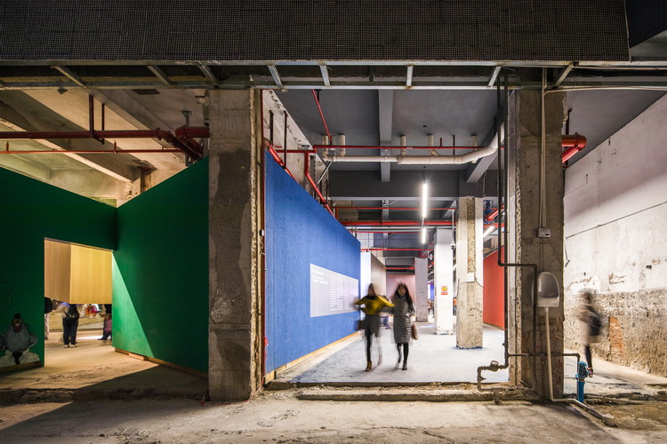 The exteriorwalls of the factoryand dormitories are essentiallymaintained in theiroriginal appearance. The existing horizontal stripe windows, tinted glass, granitic plaster, mixed pebbles, vertical white tiles,and color mosaicsof geometric patternsare preserved as much as possible.They are typical examples of exteriorwall materials widely used in 1980s and 1990s. Only the large muralpainted on the factorybuildingadds a new stroke to the layeredtraces of time. A temporary metal shedon the factory squareisdismantled, and a light canopy of stretching fabric is built along the eastwalltoaccommodatean open-air café. At dusk, when the canopy is lit up from inside, it looks like a huge lantern floating abovethe square between the factory and village buildings. The enclosing wall on the west side of the factory is demolishedto allow the factoryarea to merge into the surrounding neighborhoods. The exteriorwall of the groundfloor of the main plant is removed,and a north-south inner street connecting the other two buildingsis created. Another intersectingpassage connects the square to the east and the alley on the west side,and eventually leads to the public stage and Zhongshan Park. After opening up the first floor of the mainbuilding, a series of enclosed spaces with different sizes and colors are scattered around.Theywill be used as venues for various themed exhibitions. The irregular alleywaysbetween these big boxes are as complexasa maze,with embedded screens, light boxes, images, posters and bulletin boards on the walls.More contents will be added during the exhibition so that the exhibits will grow spontaneously and the atmosphere will keep changing all the time. Connected with the outdoor square it is like an open market as well as a delightful miniature theme park, suggesting that it couldbe an open creative clusterand a new living communityforyoung people in the old town.