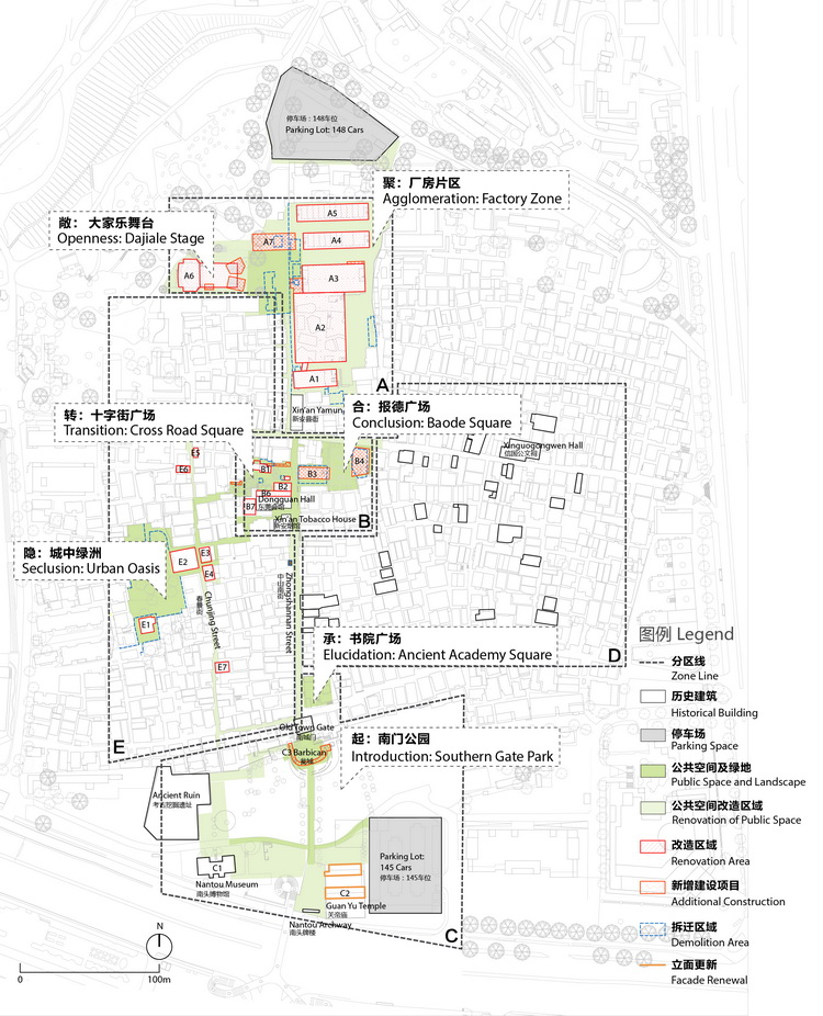 Following the urban design strategy of preservation and regenerationwhilelocating exhibition spaces for UABB, we soughtto reconstruct a public open space systeminNantou. Serving as an exhibition route, this system consists of both architectural spaces and outdoor venues. The exhibition venues are in five zones from north to south and extending out toward east and west: A. Factory Zone, B. Cross Road Zone, C. Southern Gate Zone,D.HistoricBuildingsZone,andChunjing Street Zone. The whole exhibition spatial narrative is formed with the following seven interlocking themes, like the structure of Chinese literature or drama.